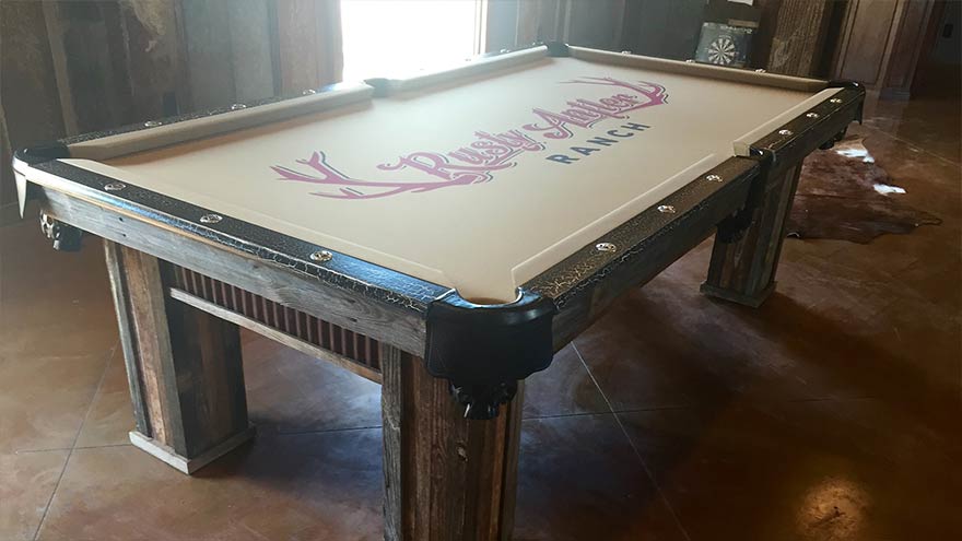 The centerpiece is an 8-foot Texas Colt pool table with distinctive customization: