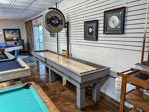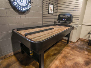 Handcrafted and local to the Dallas metroplex, Champion Shuffleboard has refined and improved the processes for building, curing, and adjusting playfields over the last 30 years. Their shuffleboard cradles are beautifully crafted with premium woods and a wide selection of stains and styles to complement any game room. These tables are great to play on and equally great to look at!